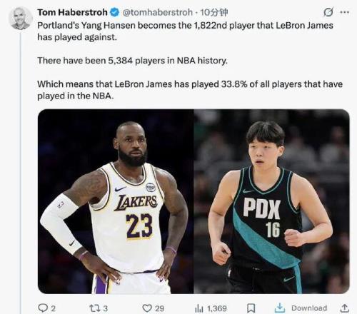 上场打湖人,杨瀚森最后3分钟获得了上场机会,NBA职业生涯第一次对阵詹姆斯,然后他成为了 詹姆斯生涯对阵过的第1822名对手。